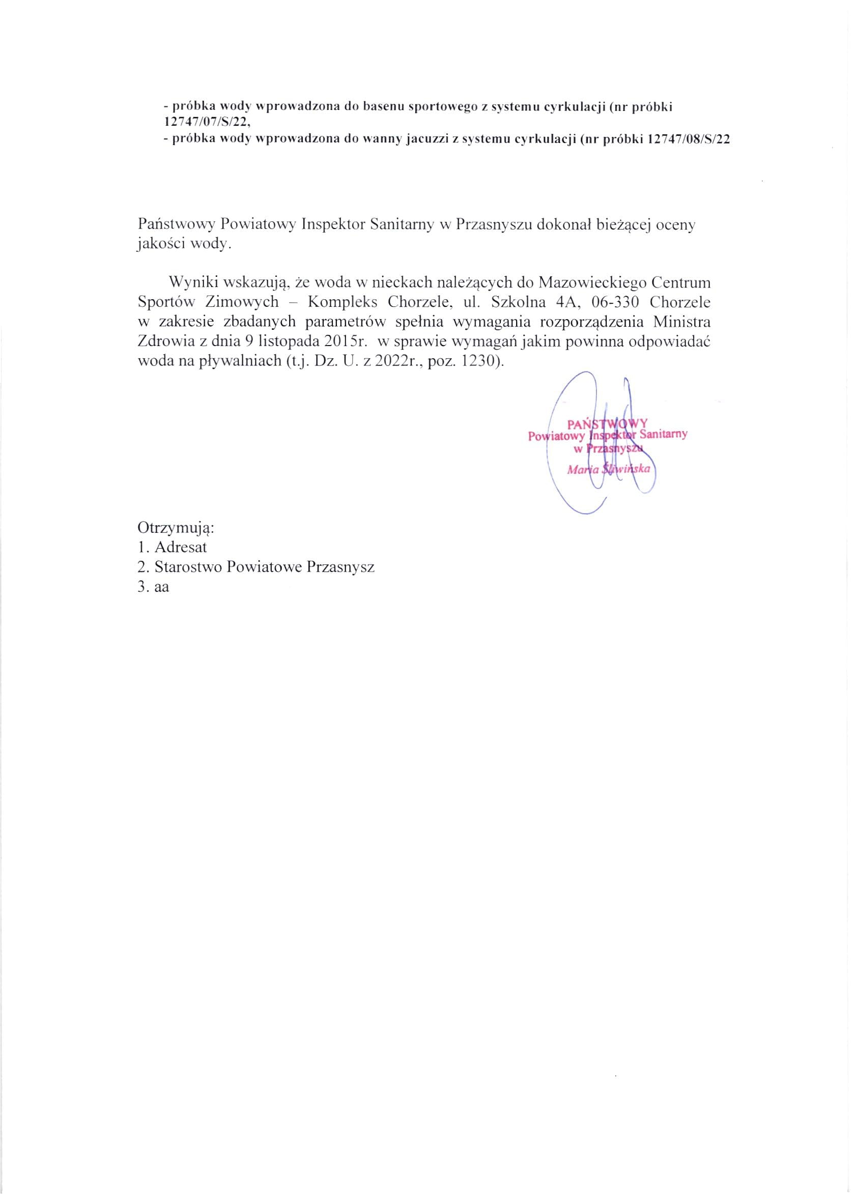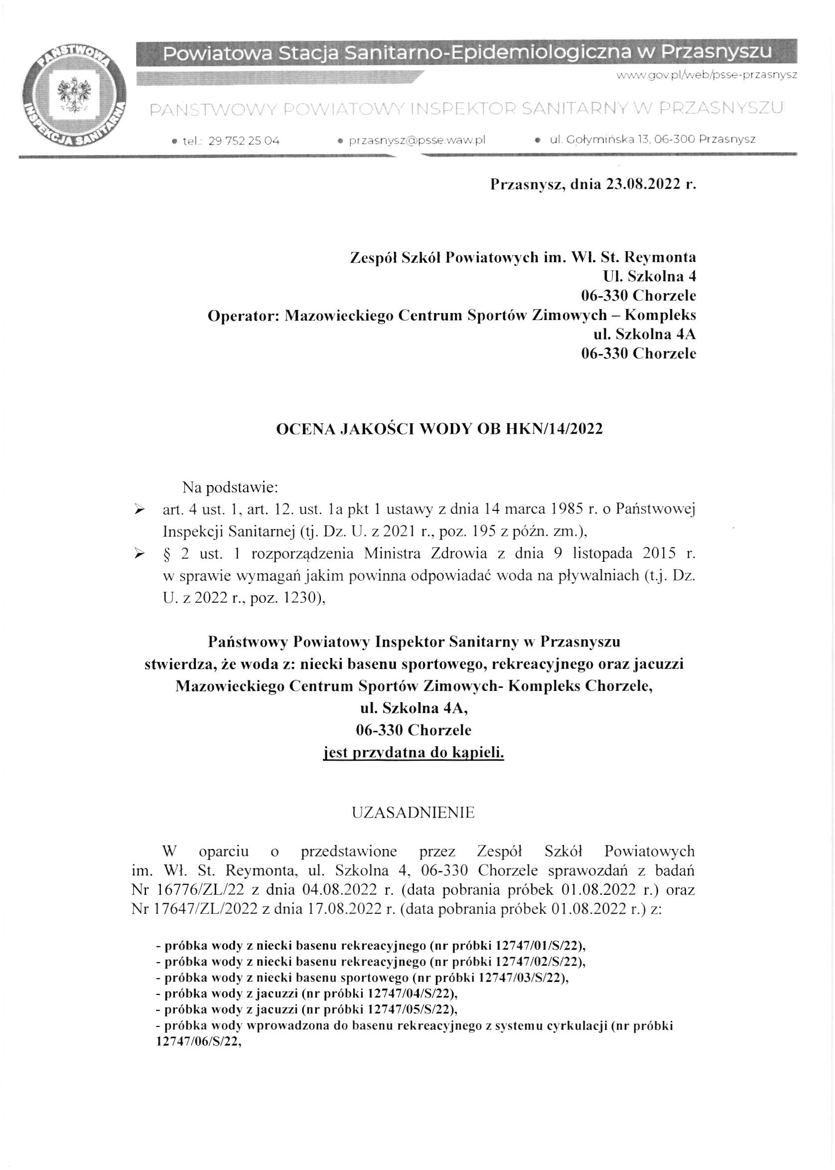 Ocena jakości wody z dnia 23.08.2022