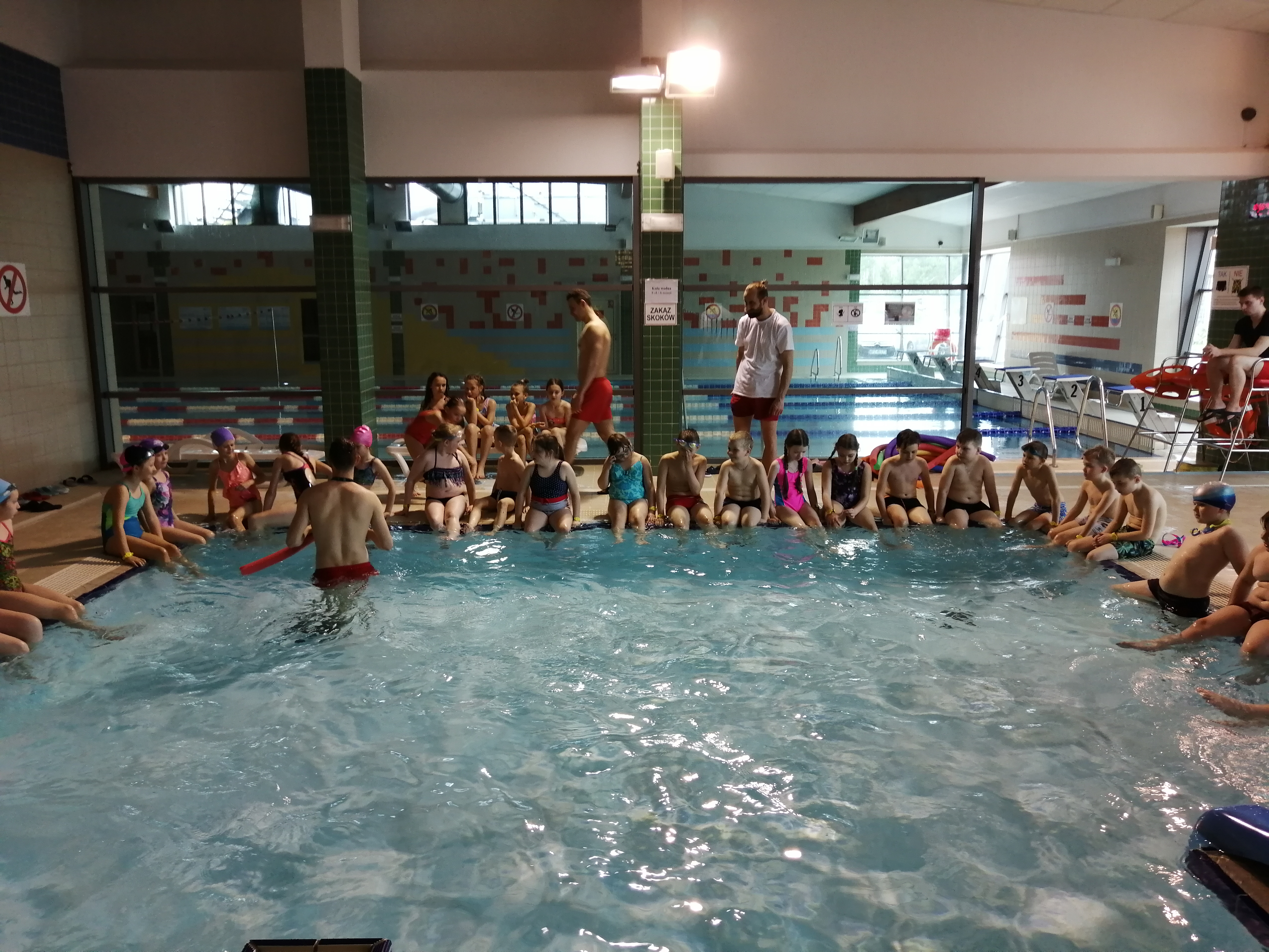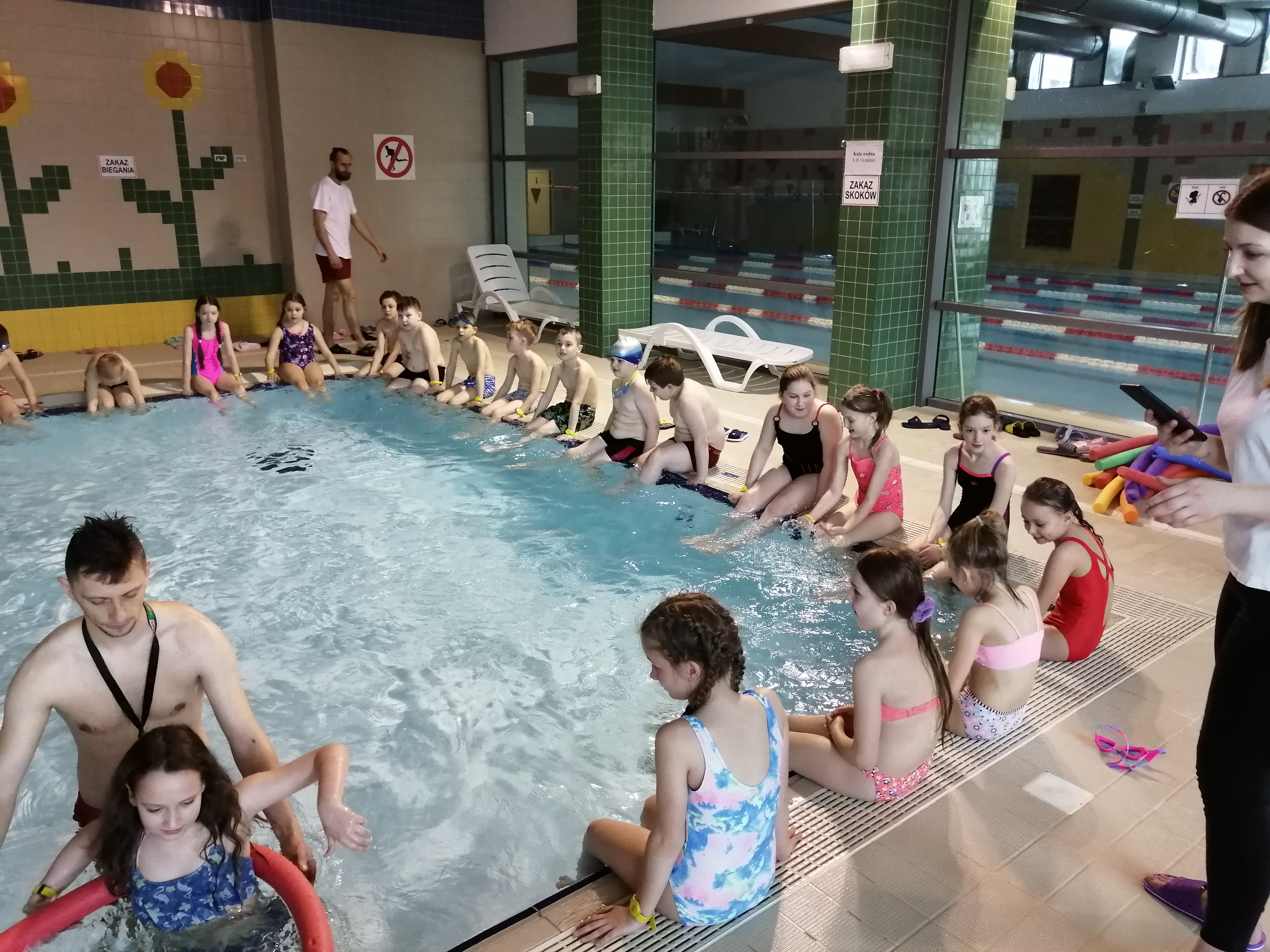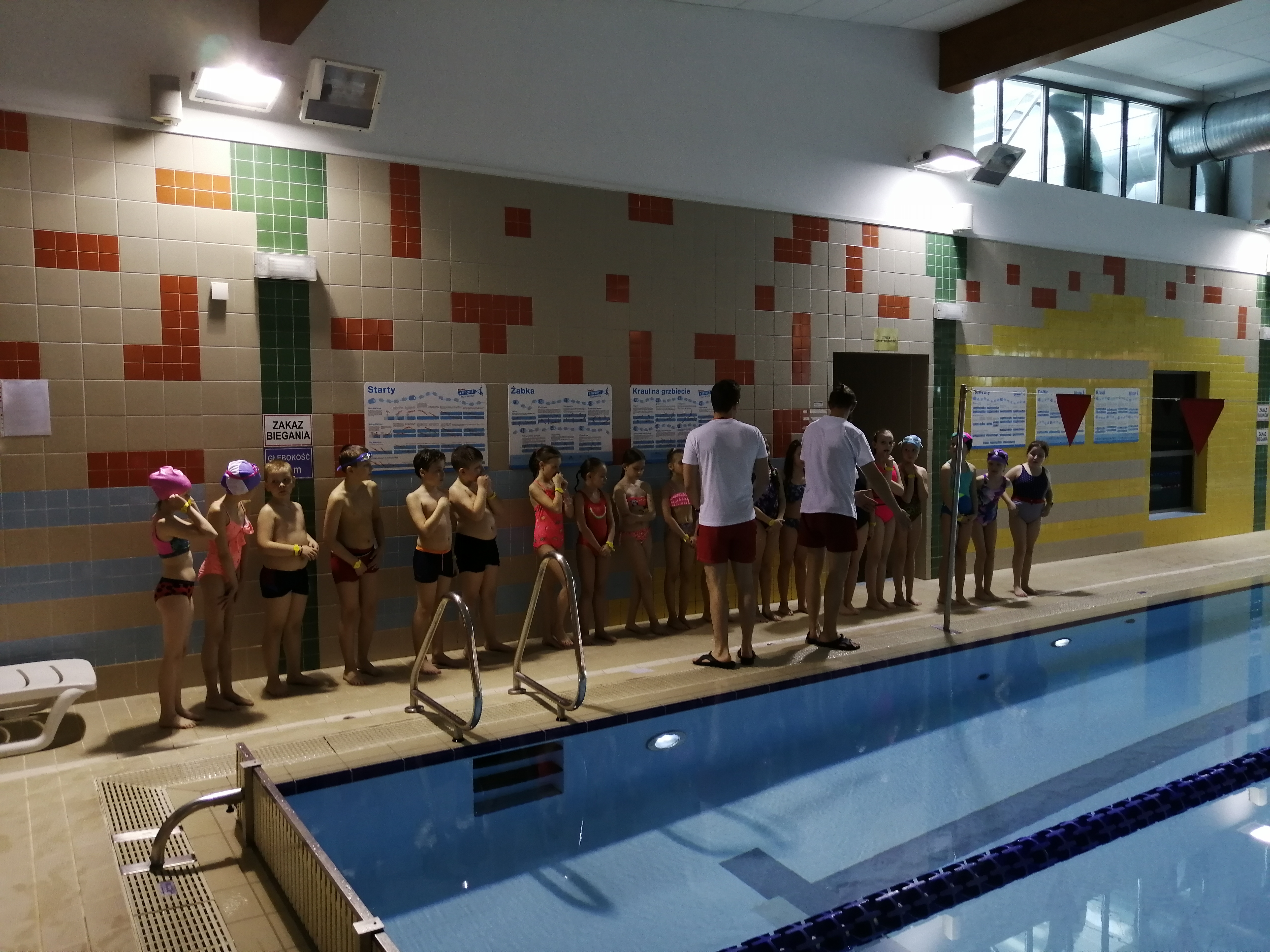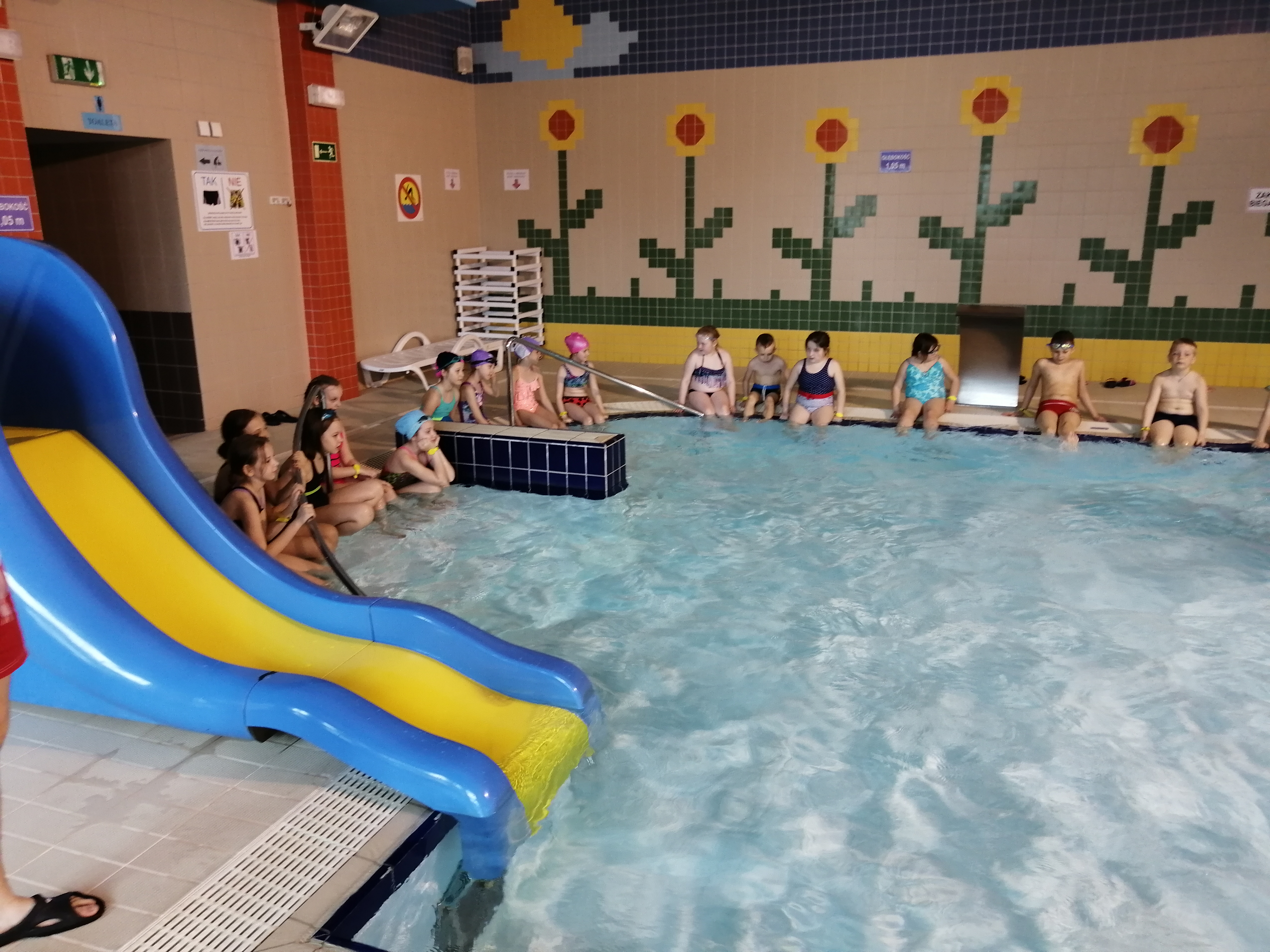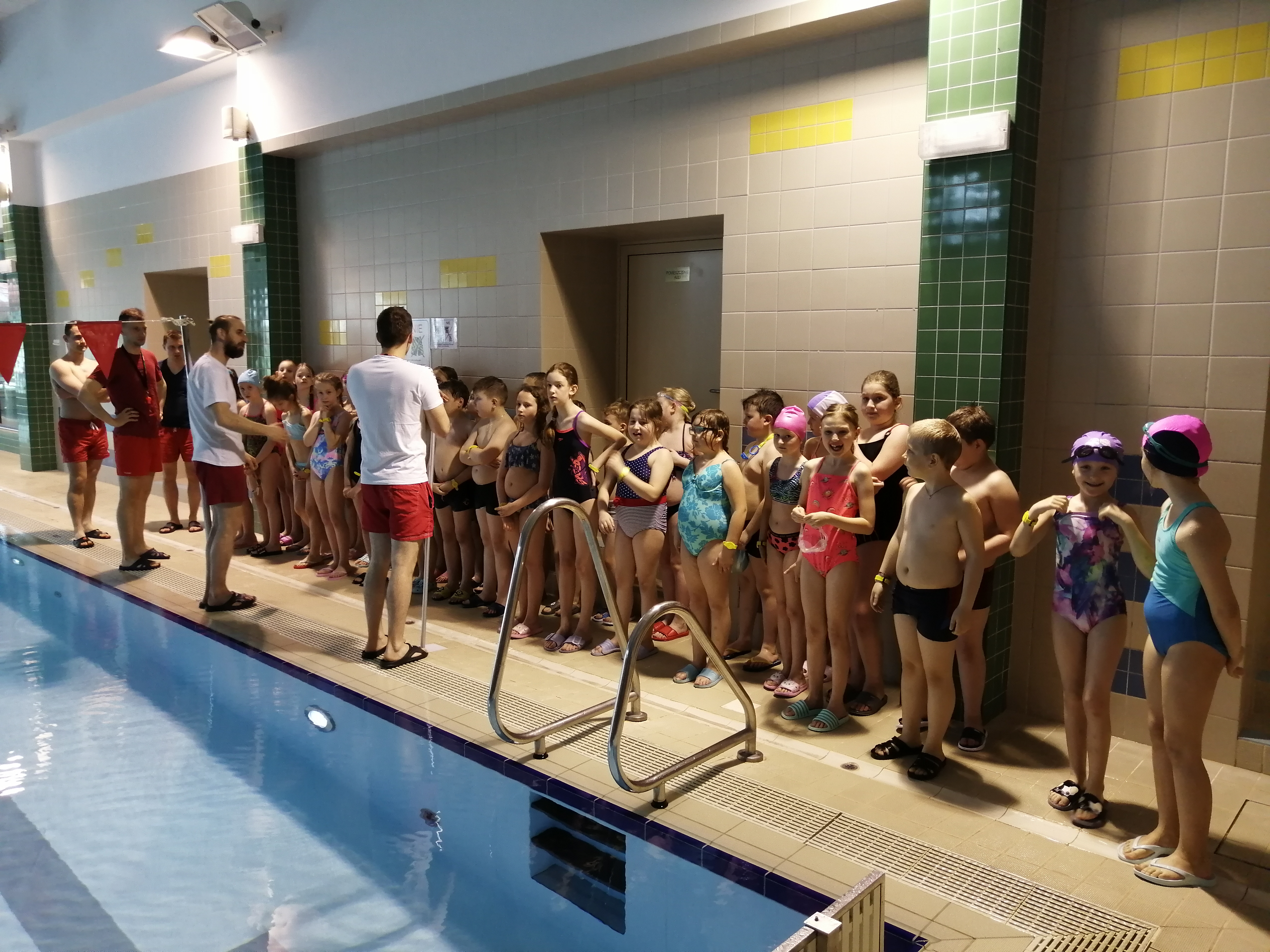 Dzieciaki poznały zasady obowiązujące na pływalni oraz przeszły egzamin wewnętrzny pozwalający je podzielić na grupy według poziomu umiejętności