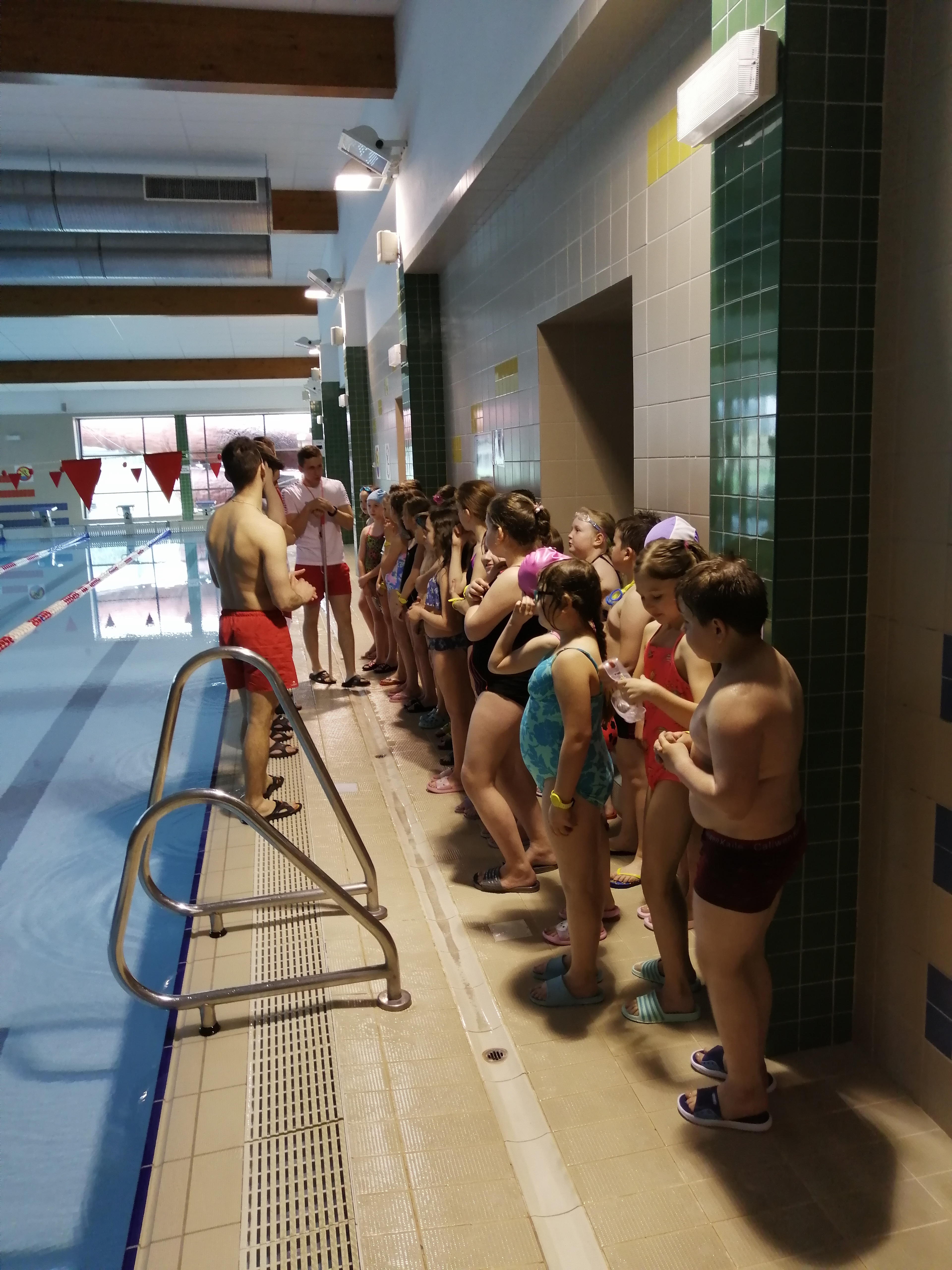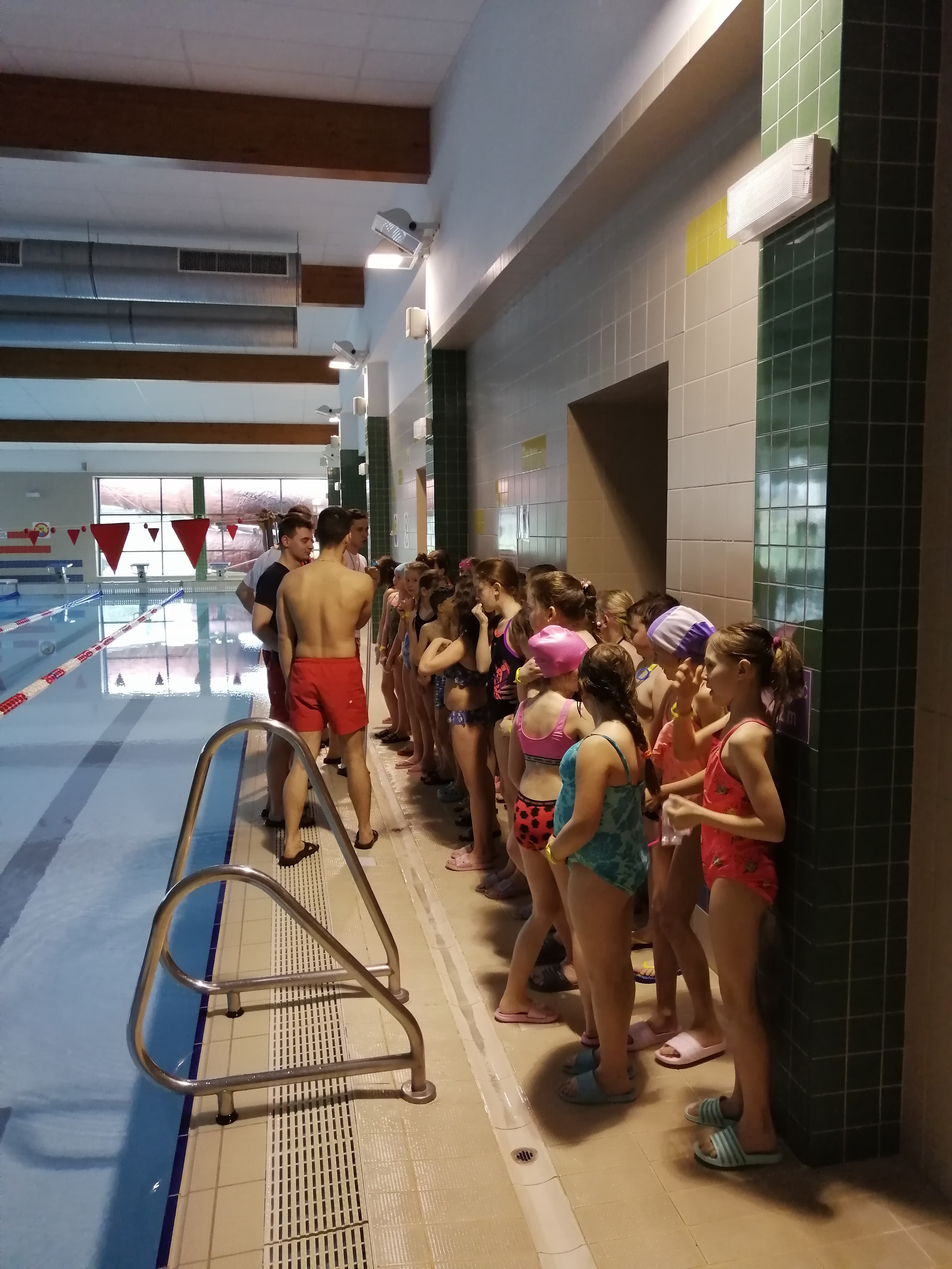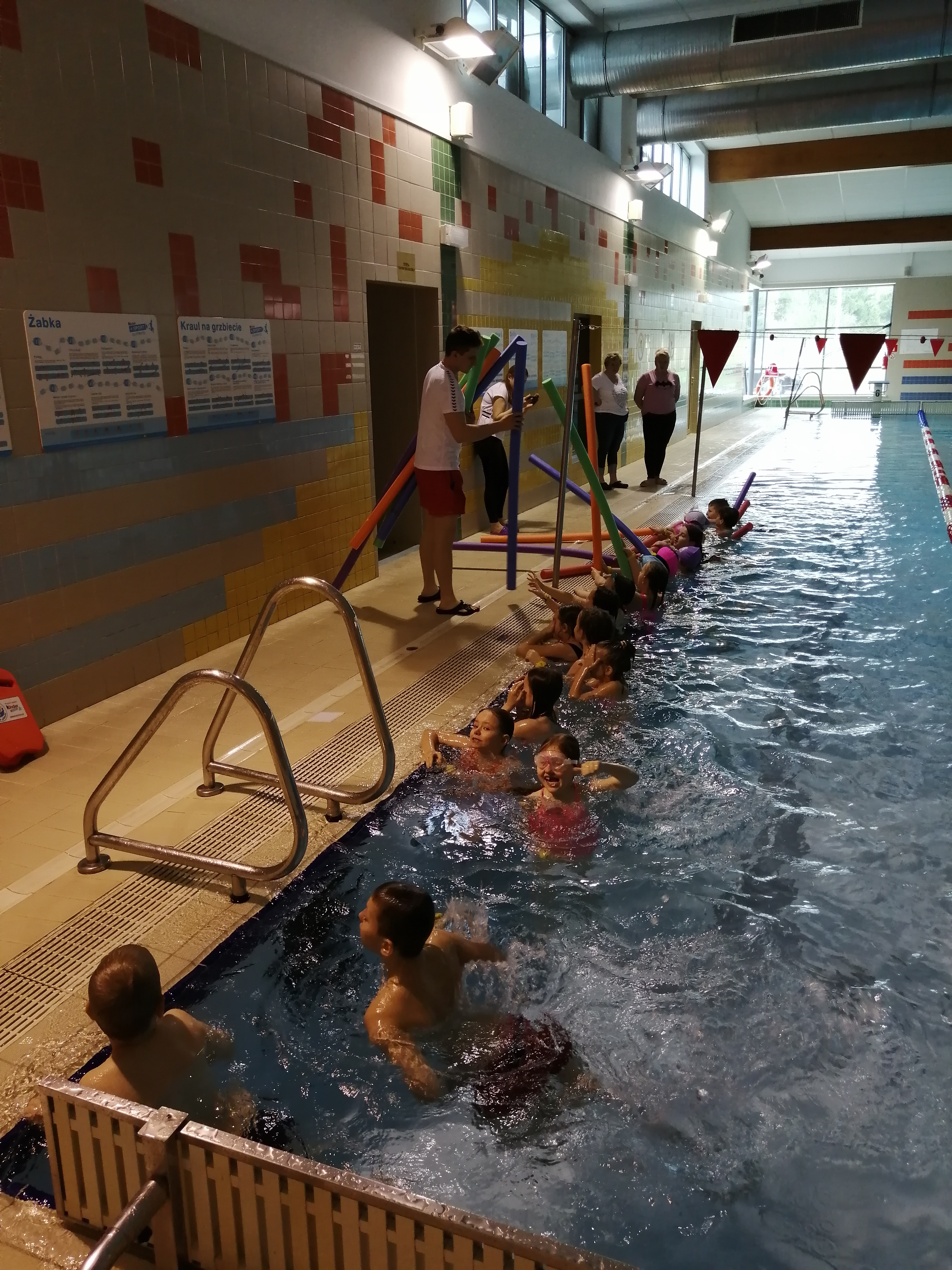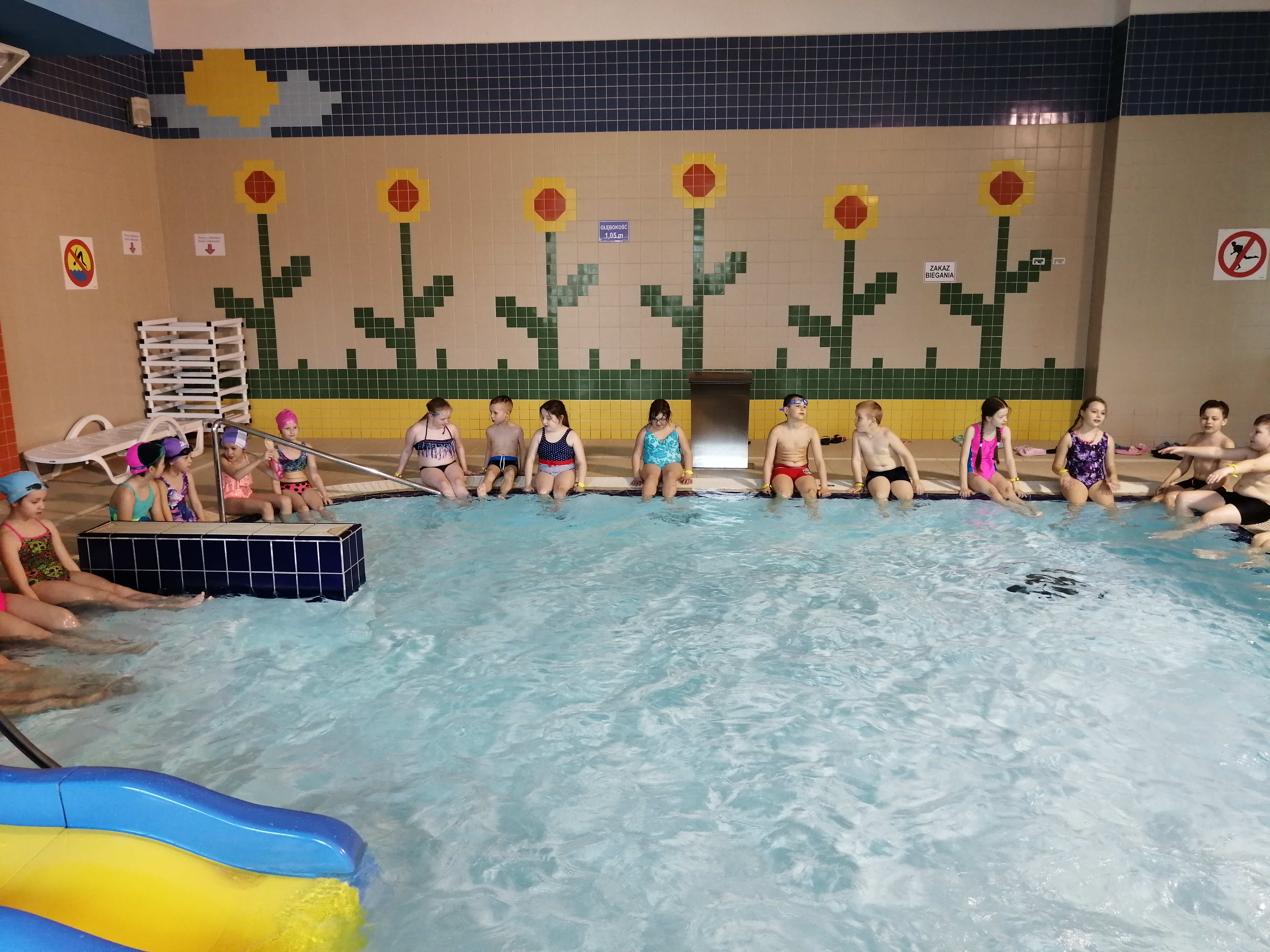 Dzieciaki poznały zasady obowiązujące na pływalni oraz przeszły egzamin wewnętrzny pozwalający je podzielić na grupy według poziomu umiejętności