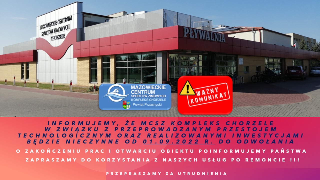 W związku z przestojem technologicznym, którego coroczne przeprowadzenie wymagają przepisy oraz inwestycjami i remontami, które zapowiadaliśmy już Państwu we wcześniejszych postach (wymiana złóż filtracyjnych, remont zjeżdżalni, remont wentylacji i wszelkie prace kosmetyczne na pływalni), MCSZ Kompleks Chorzele będzie nieczynne od dnia 01.09.2022 r. do odwołania